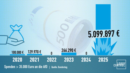Die AfD steigerte ihre Einnahmen aus Großspenden von so gut wie nichts auf über 5 Millionen Euro im Jahr 2025. Es gibt erhebliche Verdachtsmomente auf Strohmannspenden.